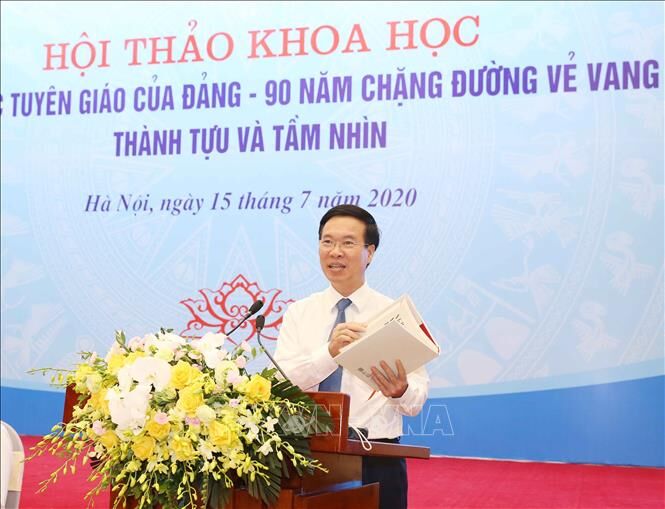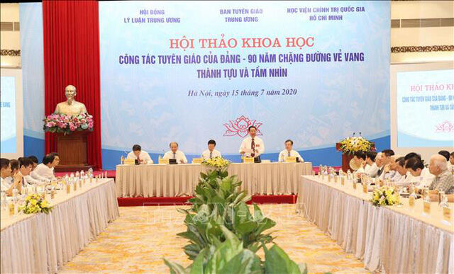 VNHN - Ngày 15/7, tại Hà Nội, Ban Tuyên giáo Trung ương đã phối hợp với Hội đồng Lý luận Trung ương, Học viện Chính trị quốc gia Hồ Chí Minh tổ chức Hội thảo "Công tác Tuyên giáo của Đảng - 90 năm chặng đường vẻ vang: Thành tựu và Tầm nhìn".