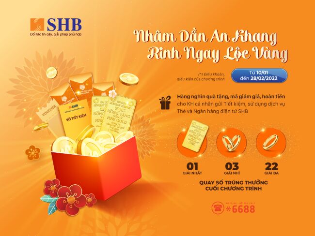 Nhân dịp Tết Nguyên Đán 2022, từ nay đến 28/02/2022, Ngân hàng Sài Gòn – Hà Nội (SHB) triển khai chương trình khuyến mại lớn “Nhâm Dần an khang – Rinh ngay lộc vàng” trên toàn hệ thống.