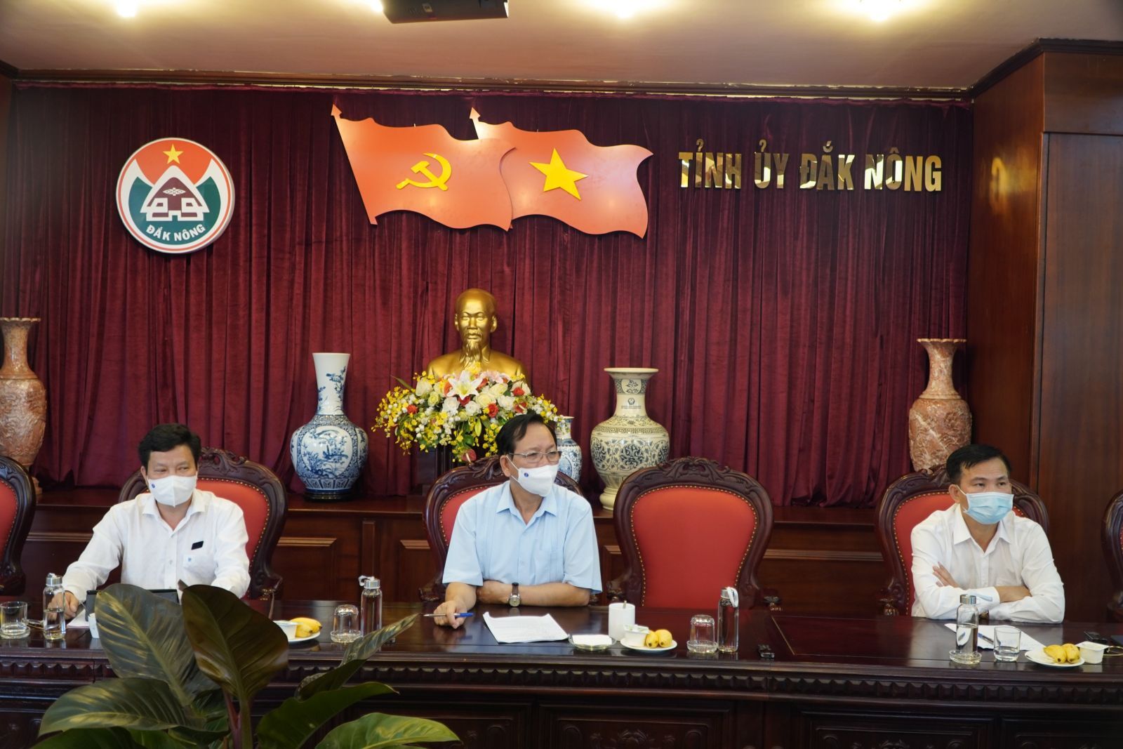 Bí thư Tỉnh ủy Đắk Nông Ngô Thanh Danh (ngồi giữa ) yêu cầu cả hệ thống chính trị từ tỉnh đến cơ sở phải vào cuộc phòng, chống dịch mạnh mẽ, quyết liệt hơn nữa.