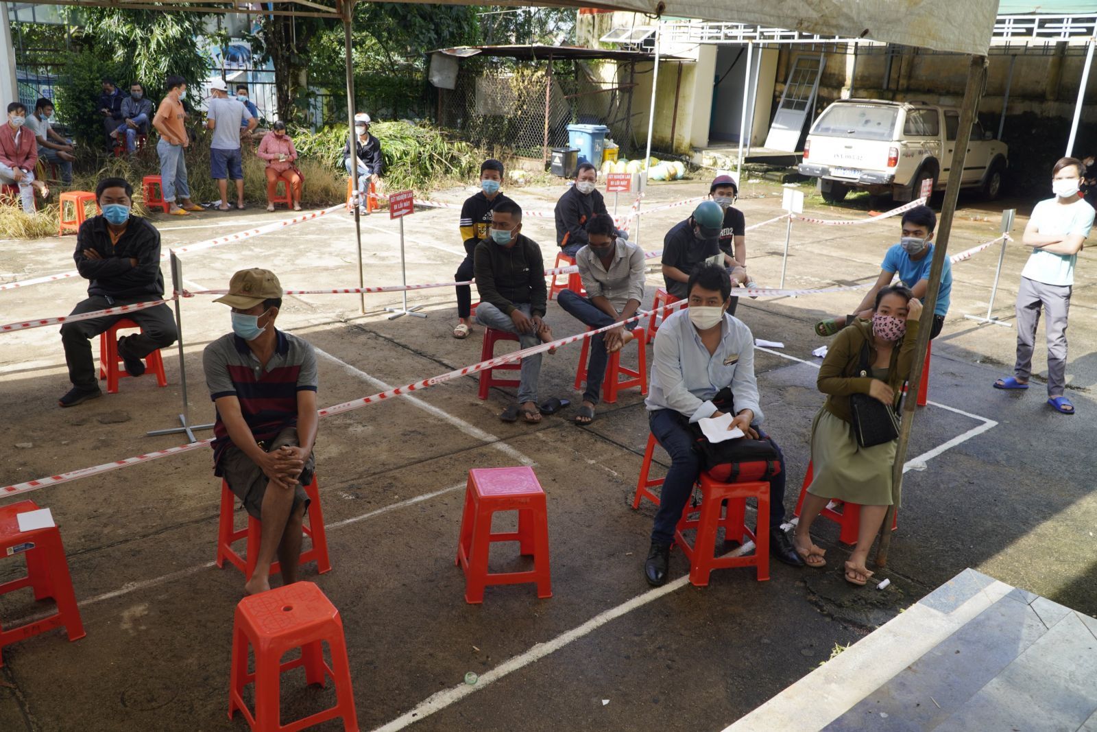 Người dân bình tĩnh ngồi giãn cách chờ kết quả xét nghiệm.
