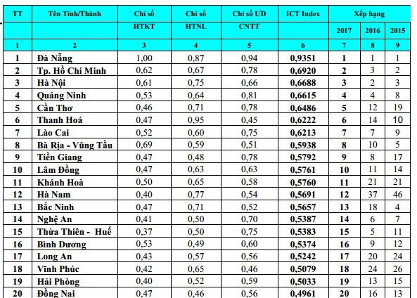 Bảng xếp hạng 20 tỉnh, thành phố trực thuộc trung ương dẫn đầu Vietnam ICT Index 2017