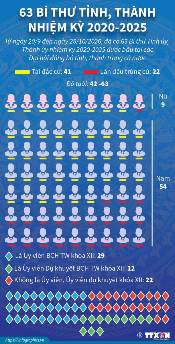 Từ ngày 20/9 đến ngày 28/10, toàn bộ 63 Đảng bộ tỉnh, thành phố trên cả nước đã tổ chức thành công Đại hội đại biểu Đảng bộ nhiệm kỳ 2020-2025, bầu ra Ban Chấp hành Đảng bộ và các Bí thư Tỉnh ủy, Thành ủy.