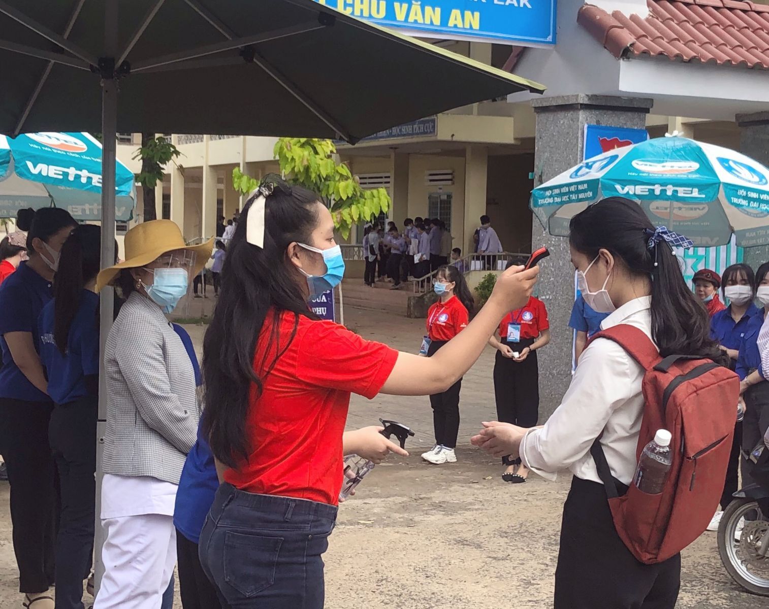 Tại trường THPT Chu Văn An, tất cả các thí sinh được kiểm tra thân nhiệt, sát khuẩn tay trước khi vào phòng thi.