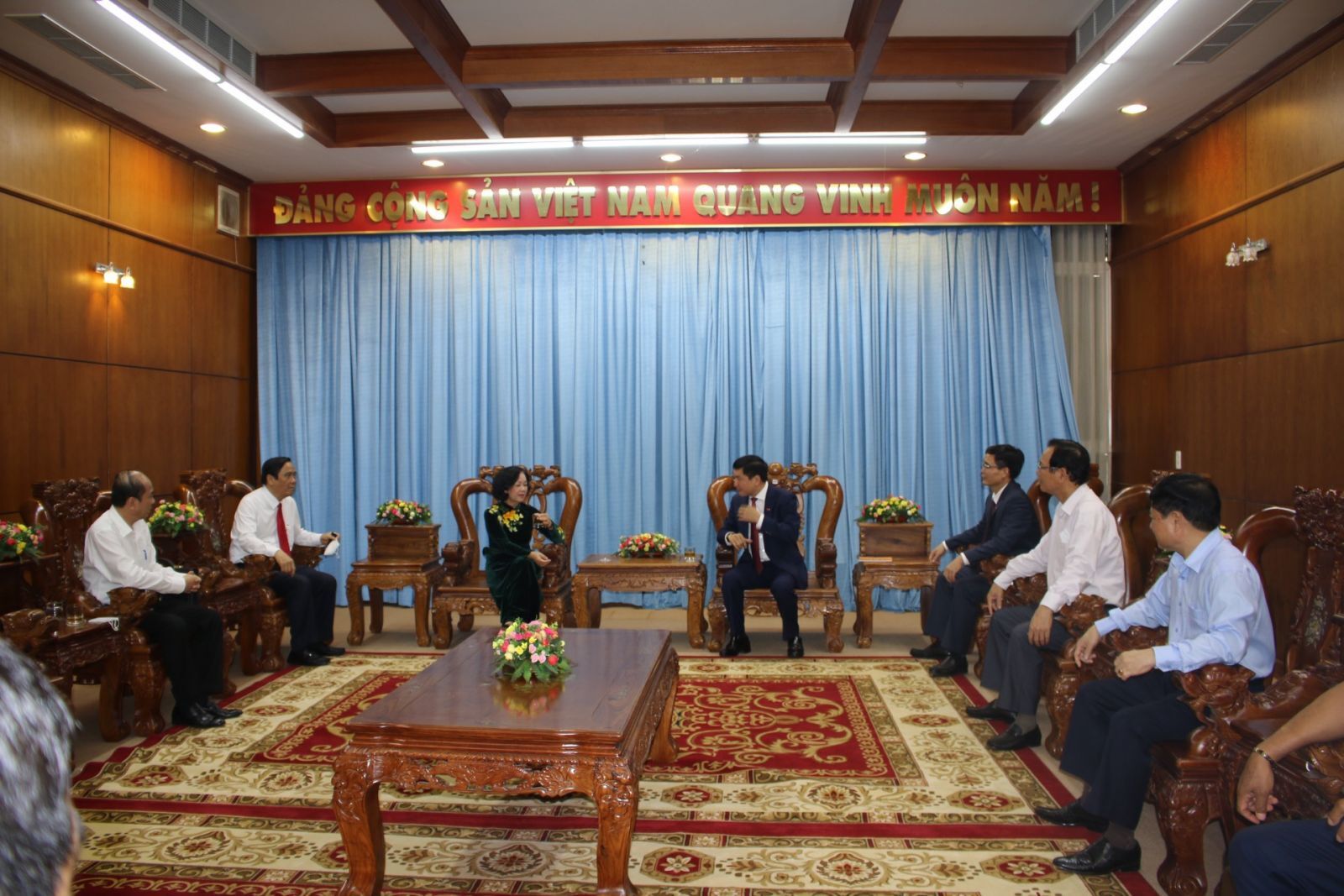 Đồng chí Trương Thị Mai chúc mừng đồng chí Bùi Văn Cường và đồng chí Nguyễn Đình Trung