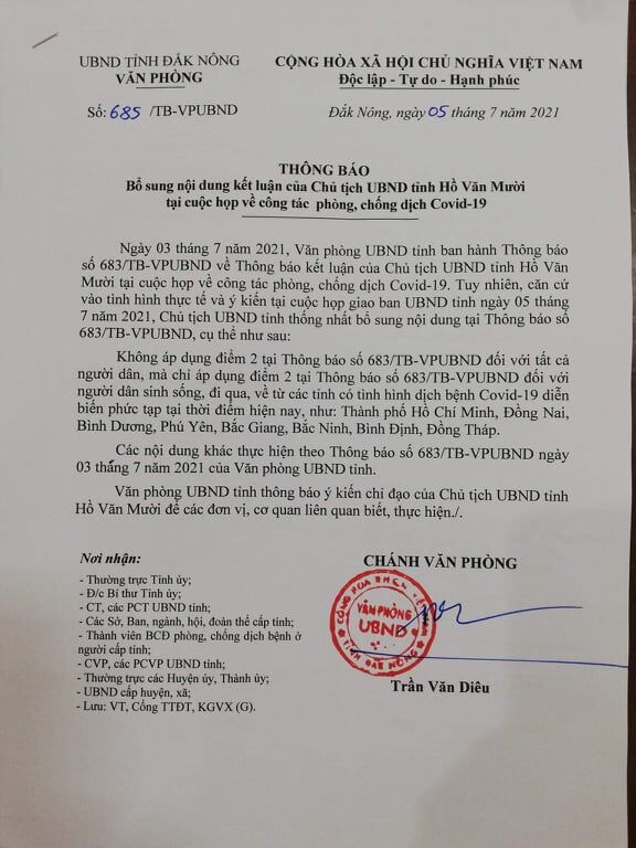 Tuy nhiên, theo Thông báo 685 ngày 5-7 của Văn phòng UBND tỉnh Đắk Nông, căn cứ tình hình thực tế và ý kiến tại cuộc họp giao ban UBND tỉnh diễn ra cùng ngày, Chủ tịch UBND tỉnh thống không áp dụng điểm 2 tại thông báo trước đó đối với tất cả người dân.
