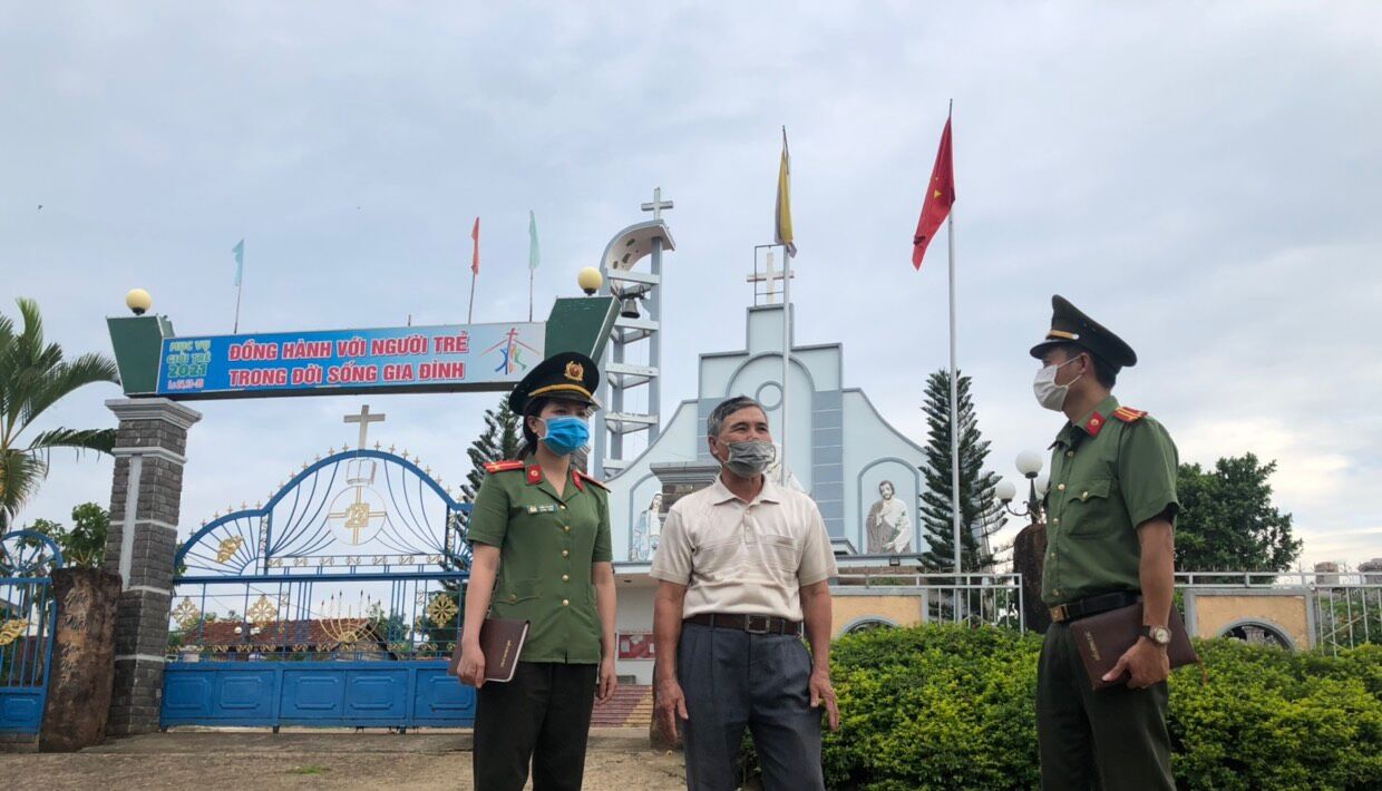 Lực lượng an ninh Công an huyện Krông Nô tuyên truyền, vận động các cơ sở tôn giáo thực hiện việc treo cờ Tổ quốc.
