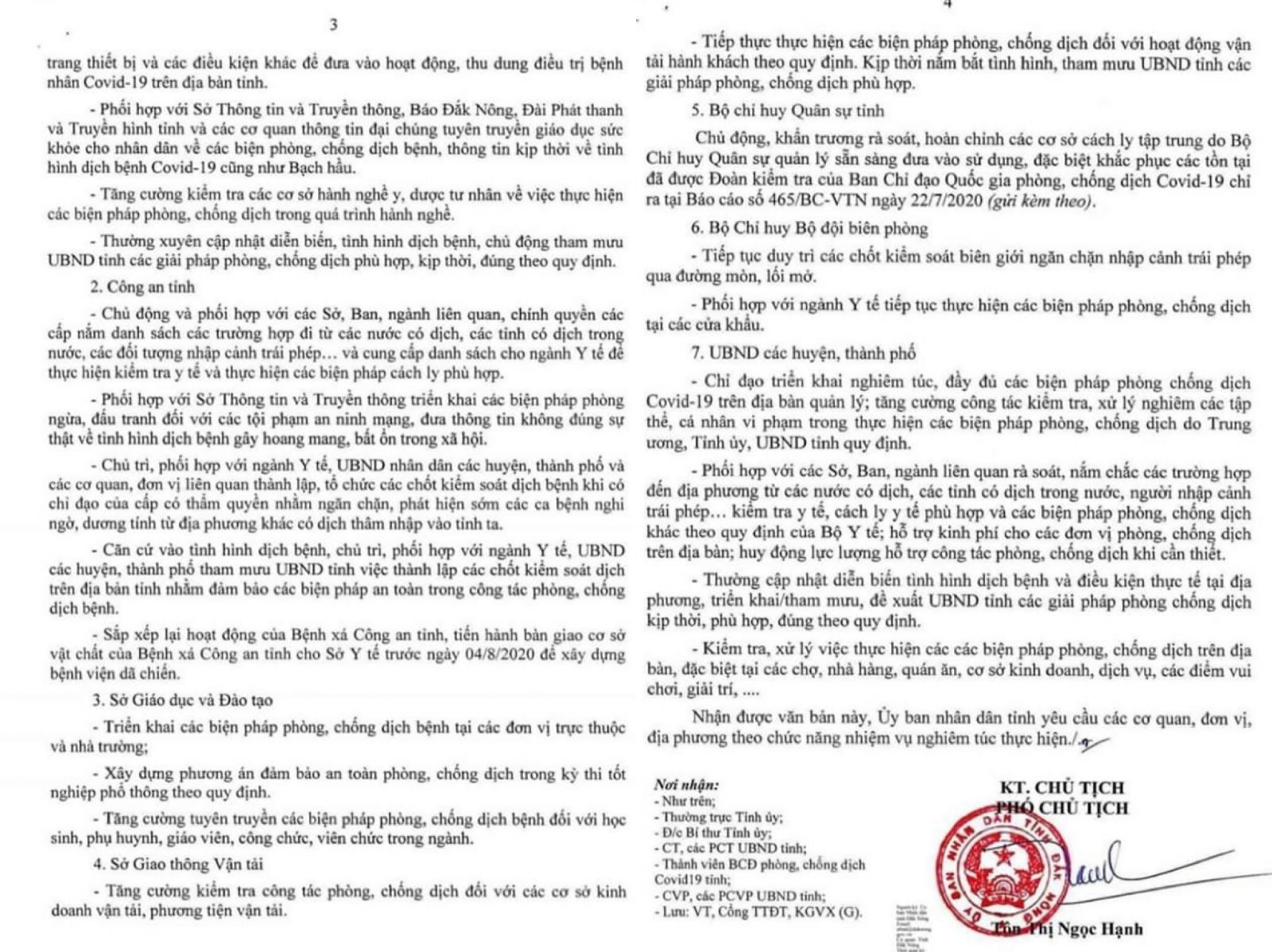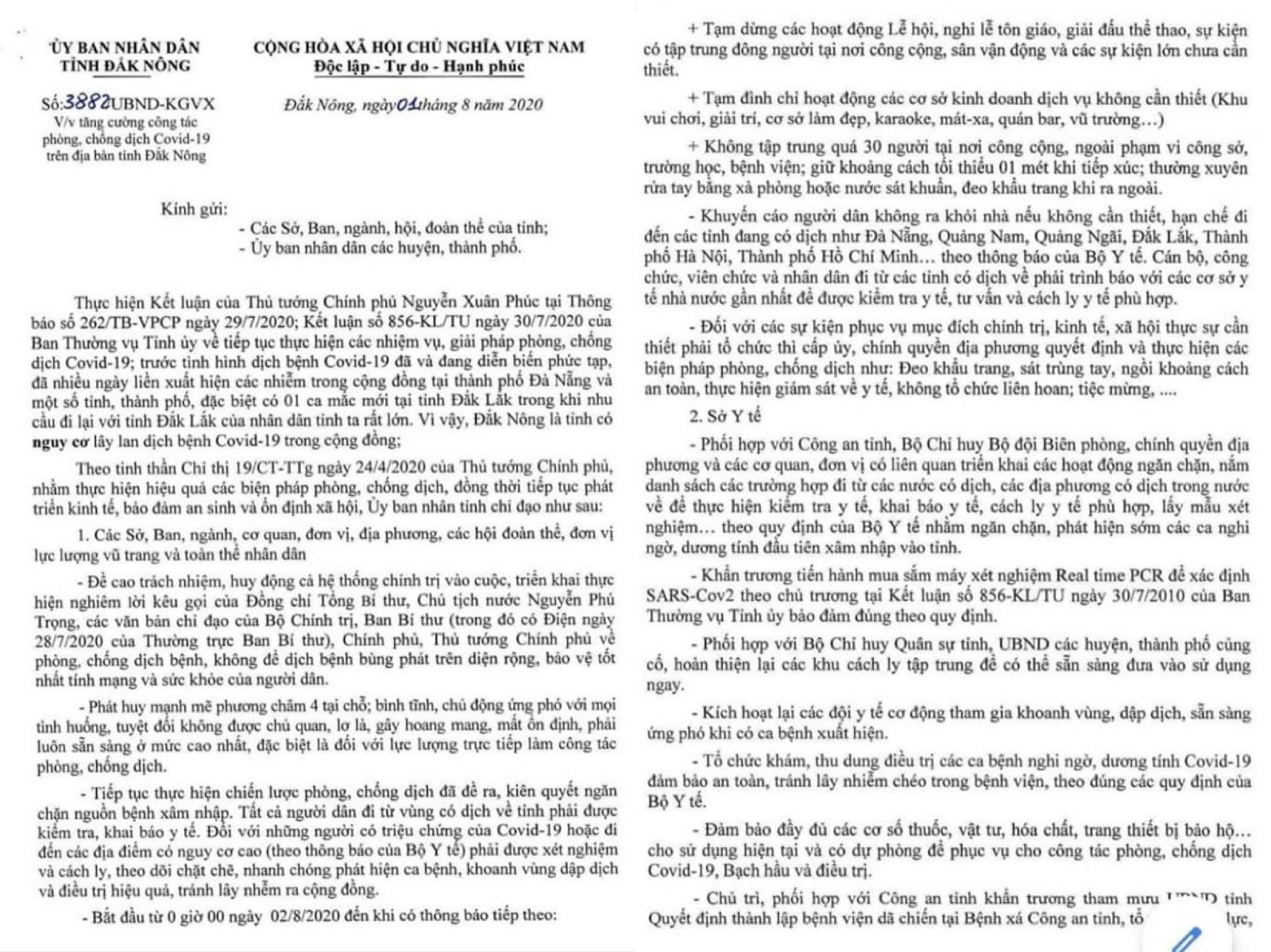 VNHN – Ngày 1/8/2020, UBND tỉnh Đắk Nông vừa ra Công văn số 3882 về tăng cường công tác phòng chống dịch Covid-19 trên địa bàn tỉnh. Tạm dừng các hoạt động Lễ hội, nghi lễ tôn giáo, giải đấu thể thao, sự kiện tập trung đông người tại nơi công cộng, sân vận động và các sự kiện lớn, dịch vụ chưa cần thiết.