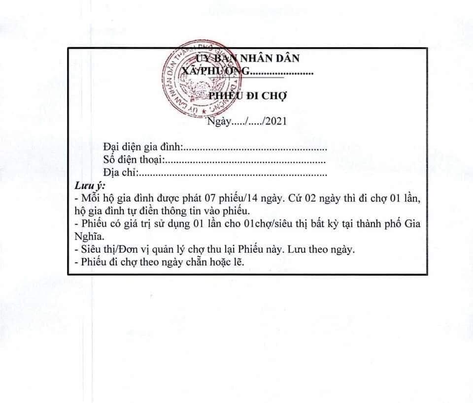 Đại úy Nguyễn Tiến Thành – Bí thư Đoàn Thanh niên Công an thành phố Gia Nghĩa cho biết “Hiện nay thành phố đã và đang triển khai đã tổ chức phát phiếu đi chợ cho người dân trên địa bàn. Mỗi gia đình được phát 7 phiếu trong thời gian 14 ngày giãn cách xã hội. Phiếu để trống ngày, đại diện hộ gia đình, số điện thoại và địa chỉ cụ thể. Đại diện hộ gia đình cứ 2 ngày được đi chợ 1 lần (theo ngày chẵn hoặc lẻ in trên phiếu) và tự điền thông tin vào phiếu. Phiếu đi chợ có giá trị sử dụng 1 lần cho 1 chợ/siêu thị bất kỳ tại thành phố. Siêu thị hoặc đơn vị quản lý chợ thu phiếu và lưu theo ngày. Các phiếu có giá trị ngay khi người dân nhận được. Cùng với đó, để tạo điều kiện thuận lợi cho người dân trong thời gian thực hiện giãn cách xã hội, Đoàn Thanh niên Công an thành phố Gia Nghĩa còn phối hợp với các ban, ngành, đoàn thể hỗ trợ người dân mua và vận chuyển các mặt hàng thiết yếu nhằm góp phần thực hiện tốt công tác phòng, chống dịch hiệu quả”.