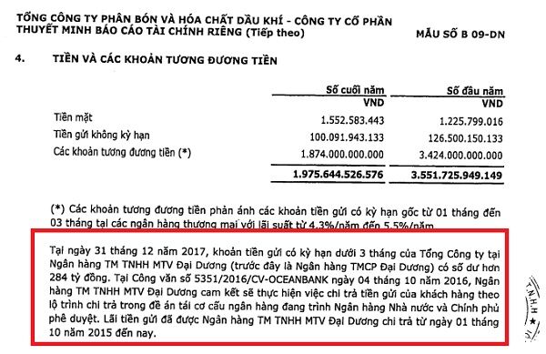 Theo báo cáo tài chính hàng năm của Đạm Phú Mỹ có phản ánh các khoản nợ xấu lên đến gần 1.000 tỷ đồng, trong đó có số tiền gần 290 tỷ đồng gửi vào OceanBank. Đây là một khoản tiền gửi được báo cáo là thực hiện theo chiến lược chung của PVN và của Đạm Phú Mỹ trong giai đoạn 2007 – 2015.