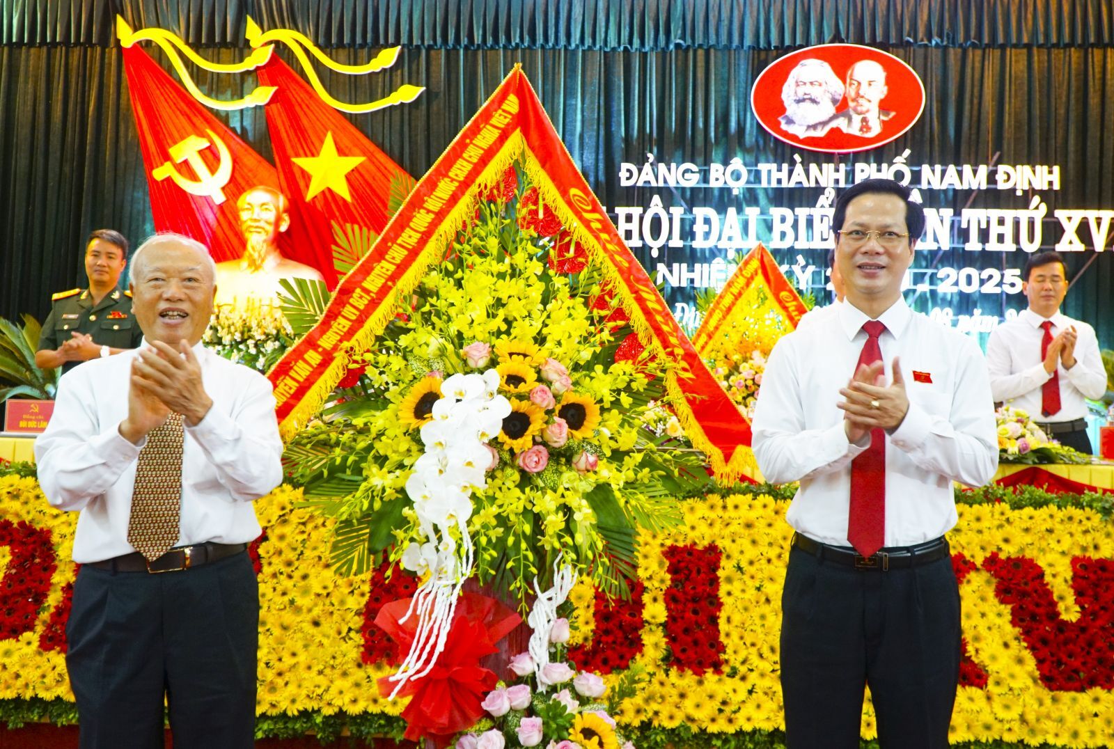 Đồng chí Đoàn Hồng Phong, Ủy viên BCH Trung ương Đảng, Bí thư Tỉnh ủy, Trưởng đoàn Đoàn đại biểu Quốc hội tỉnh Nam Định tặng hoa chúc mừng Đại hội