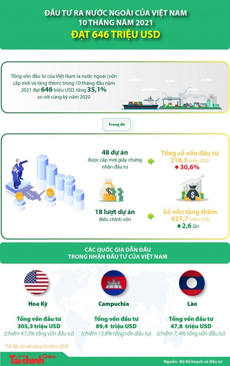 Theo số liệu báo cáo của Bộ Kế hoạch và Đầu tư, tổng vốn đầu tư của Việt Nam ra nước ngoài trong 10 tháng năm 2021 đạt 646 triệu USD, tăng 35,1% so với cùng kỳ năm năm 2020.