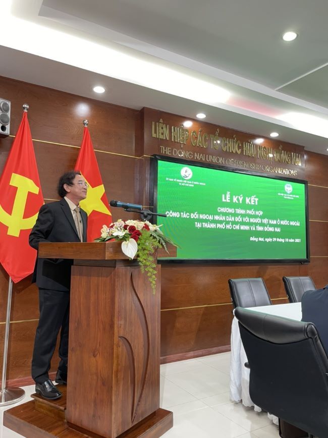 Phát biểu tại buổi lễ, ông Nguyễn Thành Trí – Chủ tịch Liên hiệp các tổ chức hữu nghị tỉnh Đồng Nai cho biết: "Lễ ký kết Chương trình phối hợp giữa Ủy ban về NVNONN TP Hồ Chí Minh và DUFO được tổ chức ngay sau khi Bộ Chính trị vừa có Thông báo kết luận số 12-KL/TW về “công tác đối với người Việt Nam ở nước ngoài trong tình hình mới”, thể hiện sự quan tâm của các cấp ủy và chính quyền của hai địa phương về công tác đối ngoại nhân dân và công tác về người Việt Nam ở nước ngoài, sự nhạy bén, linh hoạt, sáng tạo của hai cơ quan nhằm đổi mới, đa dạng hóa các hình thức triển khai vận động nhằm thực hiện tôn chỉ “Người Việt Nam ở nước ngoài là một bộ phận không thể tách rời, là nguồn lực của cộng đồng dân tộc Việt Nam” theo tinh thần Nghị quyết 36-NQ/TW của Bộ Chính trị".