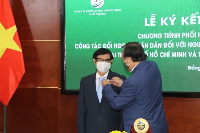 Chủ nhiệm UB về NVNONN TP.HCM Phùng Công Dũng trao tặng huy hiệu của tổ chức cho P.CT UBND tỉnh Nguyễn Sơn Hùng