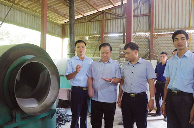 Ông Mùa A Sơn - Phó Bí thư Tỉnh ủy, Chủ tịch UBND tỉnh Điện Biên (đứng thứ hai từ trái sang) tham quan nhà máy sản xuất chế biến chè của Công ty CP giống cây trồng Điên Biên.