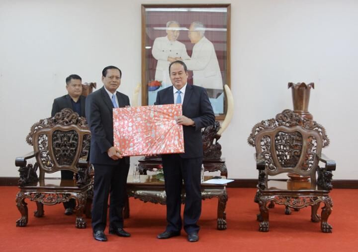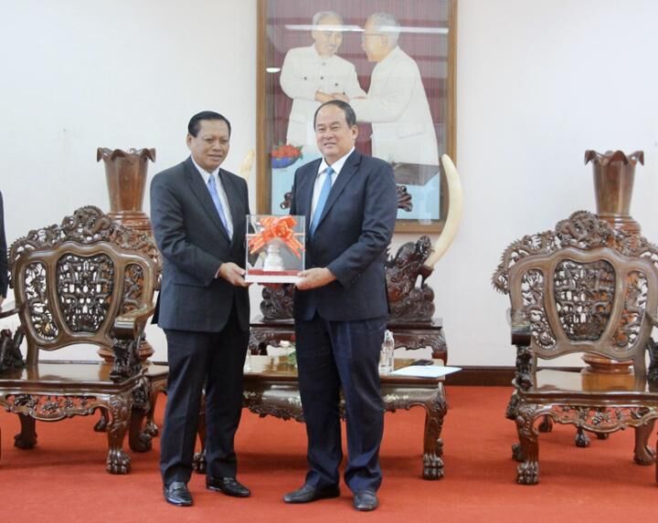 Ông Bounthong Divixay, Bí thư Tỉnh uỷ, Tỉnh trưởng tỉnh Champasak tặng quà lưu niệm cho ông Nguyễn Thanh Bình, Chủ tịch UBND tỉnh An Giang.