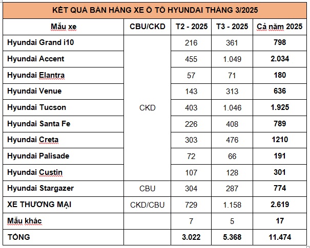 Doanh số bán hàng các mẫu xe Hyundai trong tháng 3/2025 (Đơn vị: Xe)