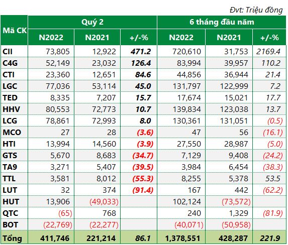 Cụ thể, trong quý II/2022, CTCP Đầu tư Hạ tầng Giao thông Đèo Cả (HOSE: HHV), Tổng Công ty Thăng Long - CTCP (HNX: TTL), CTCP Đầu tư Phát triển Cường Thuận IDICO (HOSE: CTI), CTCP Tập đoàn CIENCO4 (UPCoM: C4G) hay Tổng Công ty tư vấn thiết kế giao thông vận tải - CTCP (UPCoM: TED) có doanh thu khởi sắc vào quý 2, trong khi đó một số ông lớn BOT như CTCP Tasco (HNX: HUT), CTCP Đầu tư Hạ tầng Kỹ thuật TP.HCM (HOSE: CII), CTCP Công trình Giao thông Sài Gòn (UPCoM: GTS), CTCP Lizen (HOSE: LCG) lại ghi nhận lợi nhuận tăng trưởng.