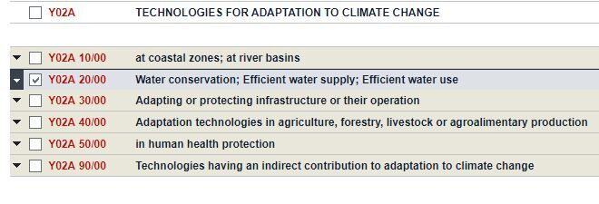 Hệ thống CPC ngoài 8 phần từ A đến H thì có thêm phần Y liên quan đến các lĩnh vực công nghệ mới phát triển, trong đó có phân loại Y02 liên quan đến các công nghệ và thiết bị làm giảm nhẹ hoặc thích ứng với biến đổi khí hậu, trong đó có nhóm Y02A 20/00 liên quan đến Bảo tồn nước; Cấp nước hiệu quả; Sử dụng nước hiệu quả.