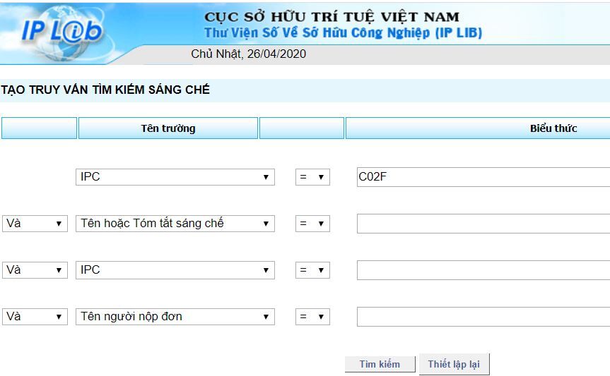 Màn hình tra cứu sáng chế của Cục Sở hữu trí tuệ (iplib.noip.gov.vn)