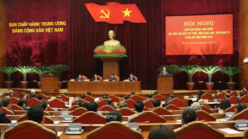 Ủy viên Bộ Chính trị, Thường trực Ban Bí thư Võ Văn Thưởng phát biểu.Trong không khí giao hòa, hân hoan của đất trời và lòng người khi vào xuân; mừng đất nước ta ngày càng vững vàng trên hành trình đổi mới và phát triển; mừng Đảng Cộng sản Việt Nam quang vinh tròn 93 mùa xuân; hôm nay, tôi cùng các đồng chí lãnh đạo Đảng, Nhà nước, lãnh đạo các cơ quan Trung ương rất vui mừng gặp mặt đại biểu trí thức, nhà khoa học, văn nghệ sĩ nhân dịp đầu Xuân Quý Mão 2023. Cuộc gặp mặt hôm nay càng thêm ý nghĩa khi chúng ta đang chuẩn bị kỷ niệm 80 năm ra đời “Đề cương về văn hóa Việt Nam” (1943-2023).