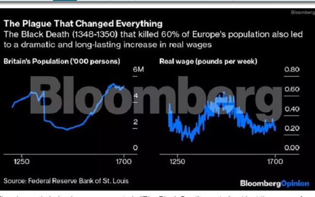 Sự gia tăng lao động giá rẻ ở Trung Quốc và Ấn Độ khiến người ta quen với việc nghĩ về chi phí tiền lương như một món hời mà trong đó các nhà tư bản luôn nắm thế thượng phong. Tuy nhiên, điều gì sẽ xảy ra nếu các biện pháp kích thích mà các nước áp dụng chống Covid-19, bao gồm hỗ trợ tiền lương, trợ cấp tiền mặt, cứu trợ cho sinh viên tiếp tục được duy trì sau khi tình trạng khẩn cấp vì virus corona đã chấm dứt? Liệu nó có thể làm mất cân bằng quyền lực một lần nữa, giống như khi đời sống của người lao động tăng cao sau Cái Chết Đen do họ kiếm được nhiều tiền trong khi hàng hóa lại rẻ mạt?