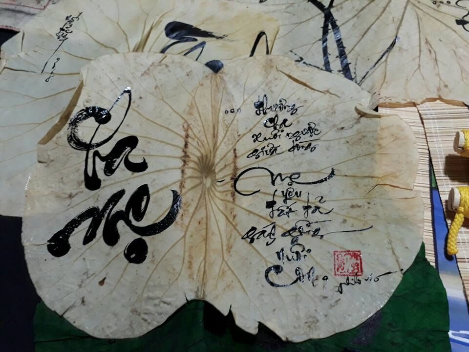 Đồng Tháp, nơi được mệnh danh là “vùng đất sen hồng,” thời gian qua đã chứng kiến rất nhiều dự án khởi nghiệp mới lạ từ cây sen; trong đó, không thể không nhắc đến thầy giáo Trịnh Phi Long (34 tuổi, ngụ tại xã Định Yên, huyện Lấp Vò) với sản phẩm tranh thư pháp trên lá sen sấy khô rất độc đáo. Nguyên liệu lá sen sấy khô hiện đã khá phổ biến tại Đồng Tháp được ứng dụng trong thủ công mỹ nghệ như trang trí nón lá, làm quạt cầm tay và một số sản phẩm khác. Theo thầy Long, viết chữ thư pháp trên lá sen khô khá kỳ công bởi lẽ lá sen có gân nên khi viết phải đòi hỏi một kỹ thuật nhất định và nội dung cần định hình trước. Chất liệu mực viết chữ cũng phải khác khi thể hiện trên giấy, sao cho không bị phai, lem và phải nổi lên trên nền lá sen.