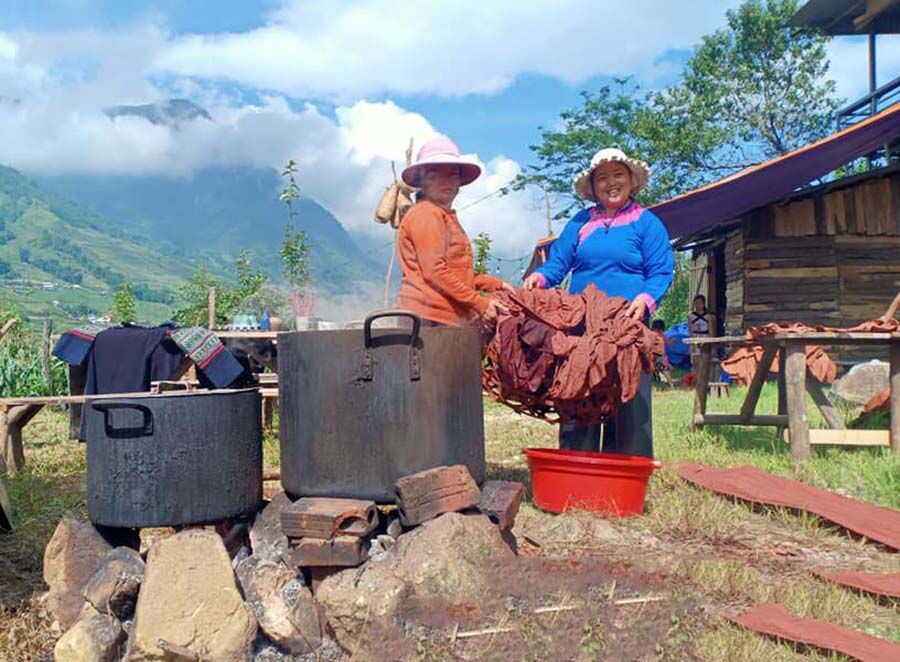 Chị Sùng Thị Lan, Giám đốc HTX Mường Hoa (phải) cùng tha nhf viên HTX nhuộm thổ cẩm.