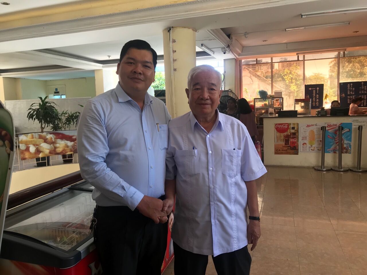 Doanh nhân Đặng Phước Thành (Áo vàng) – Chủ tịch Tập đoàn Ánh Dương VN (Vinasun) cùng Nhà báo Nguyễn Phước Lập chụp ảnh lưu niệm tại Gian hàng trưng bày “Trái cây đặc sản” Đồng Tháp.