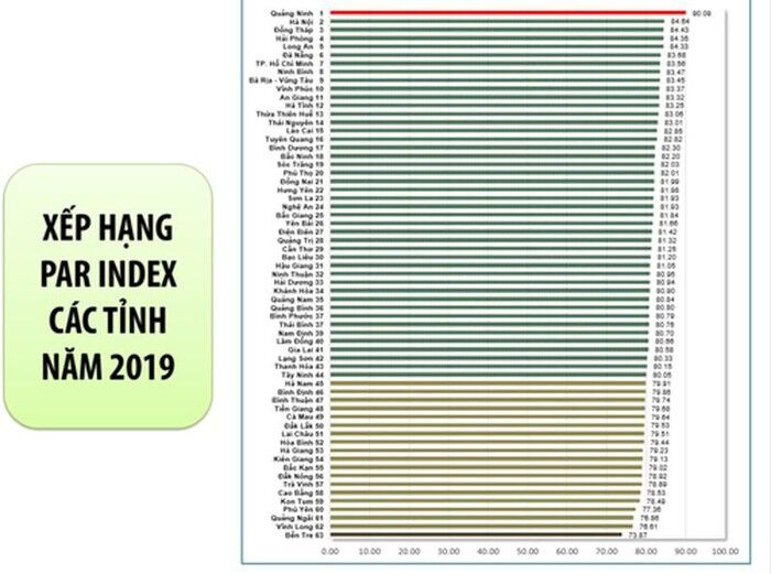 Bảng xếp hạng kết quả Chỉ số cải cách hành chính 2019 của các tỉnh, thành phố được phân theo 3 nhóm như: Nhóm A, đạt kết quả Chỉ số từ 90% trở lên, gồm 01 tỉnh (Quảng Ninh). Nhóm B, đạt kết quả Chỉ số từ 80% - dưới 90%, gồm 43 tỉnh, thành phố. Nhóm C, đạt kết quả Chỉ số từ 70% - dưới 80%, gồm 19 tỉnh, thành phố.
