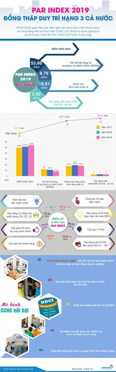 Cụ thể, Đồng Tháp xếp hạng thứ 3/63 tỉnh, thành, trong đó: Điểm thẩm định là 53.86, Chỉ số hài lòng về sự phục vụ hành chính (SIPAS) đạt 8.76 điểm, Khảo sát lãnh đạo quản lý 18.81 điểm, Tác động đến phát triển kinh tế - xã hội 3.00 điểm. Tổng điểm 84.43 (đứng đầu tại khu vực Đồng bằng sông Cửu Long). Đây là năm thứ 2 liên tiếp Đồng Tháp đứng thứ ba cả nước về Chỉ số cải cách hành chính.