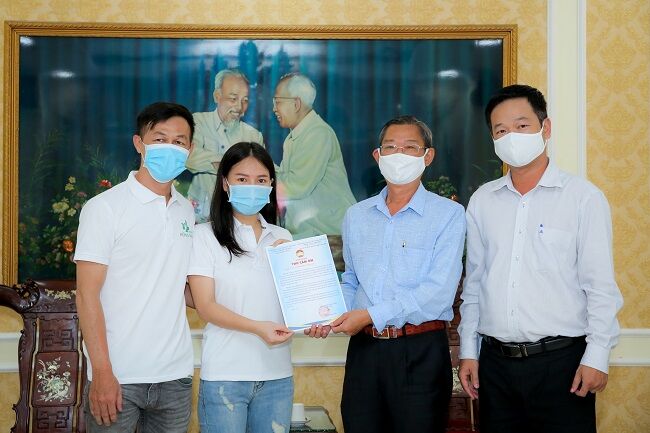 Ban lãnh đạo Công ty TNHH Đông Y Hồng Tâm trao cho ông Lý Ngọc Thạch - Uỷ Viên Ban Thường Trực, Trưởng Ban Dân Chủ - Pháp Luật Uỷ Ban Mặt Trận Tổ Quốc Thành phố 10.000 chai xịt/gel kháng khuẩn