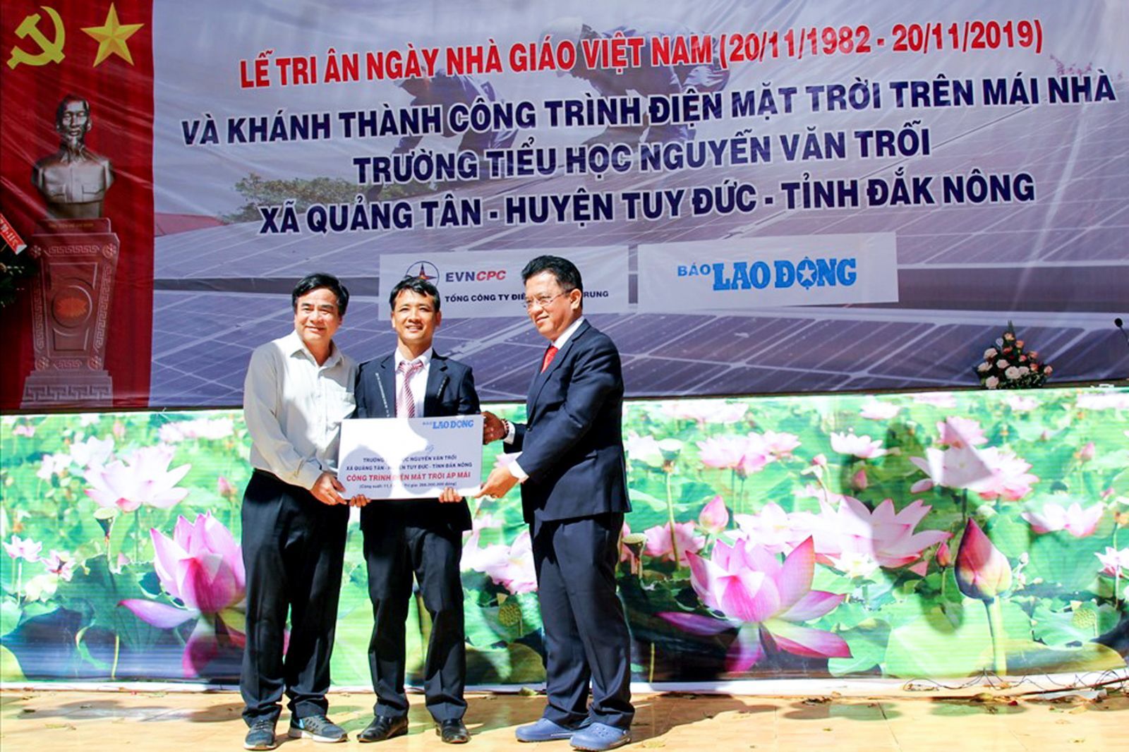 VNHN - Sáng ngày 19.11.2019, tại huyện Tuy Đức, tỉnh Đăk Nông, Tổng công ty Điện lực miền Trung (EVNCPC) và Báo Lao động đã tổ chức Lế khánh thành bàn giao hệ thống điện mặt trời áp mái cho Trường Tiểu học Nguyễn Văn Trỗi, xã Quảng Tân, huyện Tuy Đức, tỉnh Đăk Nông.
