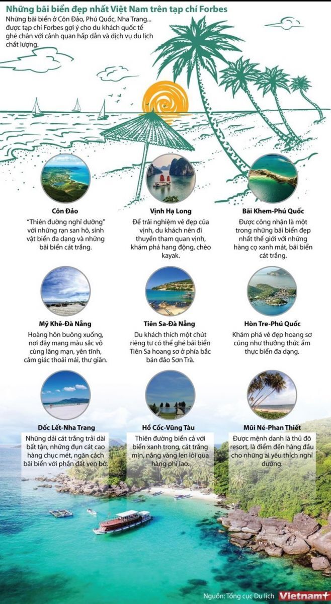 VNHN - Những bãi biển ở Côn Đảo thuộc tỉnh Bà Rịa-Vũng Tàu, Phú Quốc của tỉnh Kiên Giang, Nha Trang thuộc tỉnh Khánh Hòa... được tạp chí Forbes gợi ý cho du khách quốc tế ghé chân với cảnh quan hấp dẫn và dịch vụ du lịch chất lượng.