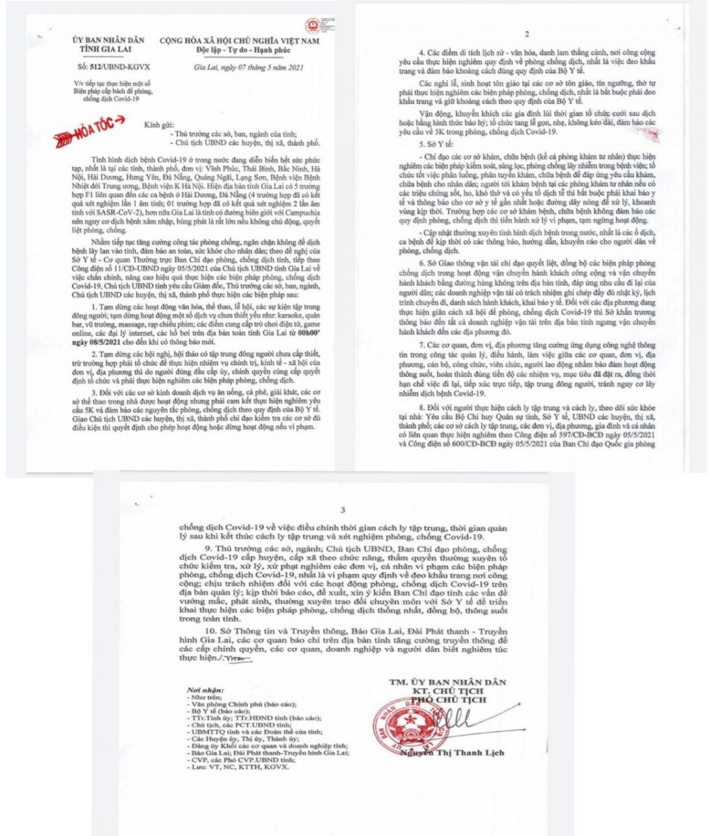 Ngày 07/05, UBND tỉnh Gia Lai có Công văn số 512/UBND-KGVX về việc tiếp tục thực hiện một số biện pháp cấp bách để phòng, chống dịch Covid-19.