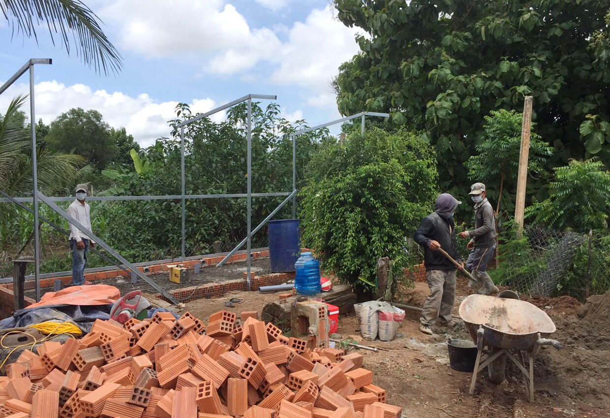 Đơn vị thi công đẩy nhanh tiến độ xây nhà vệ sinh để phục vụ người dân (Ảnh: Quang Tấn).