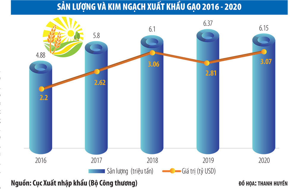 Những đơn hàng nói trên đã góp phần đáng kể vào kết quả xuất khẩu 6,15 triệu tấn gạo, trị giá 3,07 tỷ USD trong năm qua. Đặc biệt, tuy giảm khoảng 3,5% về lượng so với năm 2019, nhưng nhờ giá xuất khẩu được cải thiện, đạt bình quân 499 triệu USD/tấn (tăng 13,3% so với năm 2019), nên tổng giá trị xuất khẩu gạo năm 2020 tăng tới 9,3%.