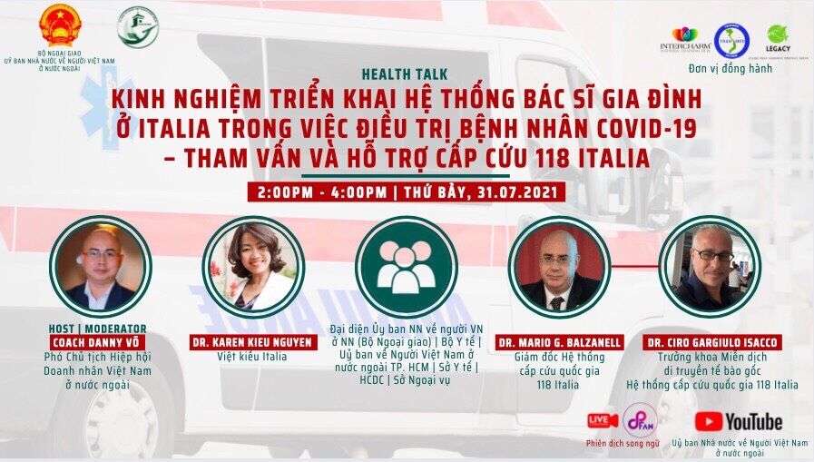 Ngày 31/7/2021, Ủy ban Nhà nước về Người Việt Nam ở nước ngoài - Bộ Ngoại giao, Ủy ban về Người Việt Nam ở nước ngoài Thành phố Hồ Chí Minh sẽ đồng tổ chức cùng quý kiều bào buổi Tọa đàm trực tuyến với Chủ đề: “Kinh nghiệm triển khai hệ thống bác sĩ gia đình ở Ý trong việc điều trị bệnh nhân Covid-19 - Tham vấn và hỗ trợ cấp cứu 118 Ý”.