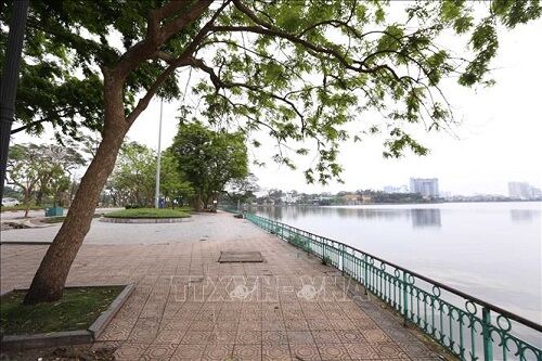 Khu vực bờ Hồ Tây phía đường Thanh Niên (Hà Nội) vắng bóng du khách, người đi dạo và tập thể dục những ngày cách ly xã hội (ảnh chụp sáng sớm 7/4/2020). (Ảnh:TTXVN)
