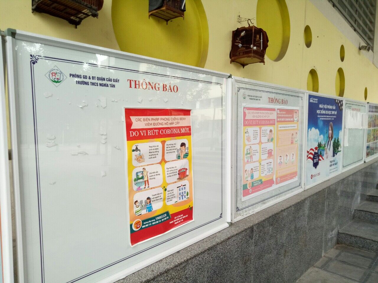 Các thông tin phòng dịch Covid-19 tại bảng tin và trong khu vực trường THCS Nghĩa Tân.