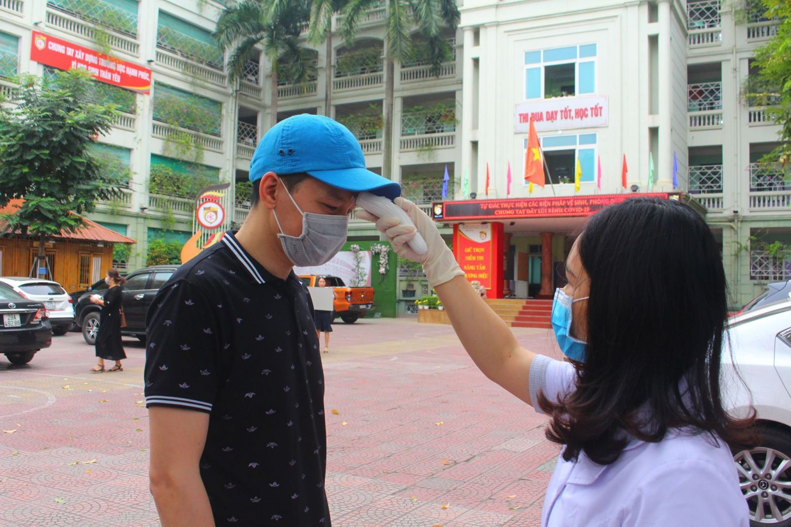 Thực hiện kiểm tra y tế, đo nhiệt độ tại khu vực cổng trường THCS-THPT Nguyễn Bỉnh Khiêm.