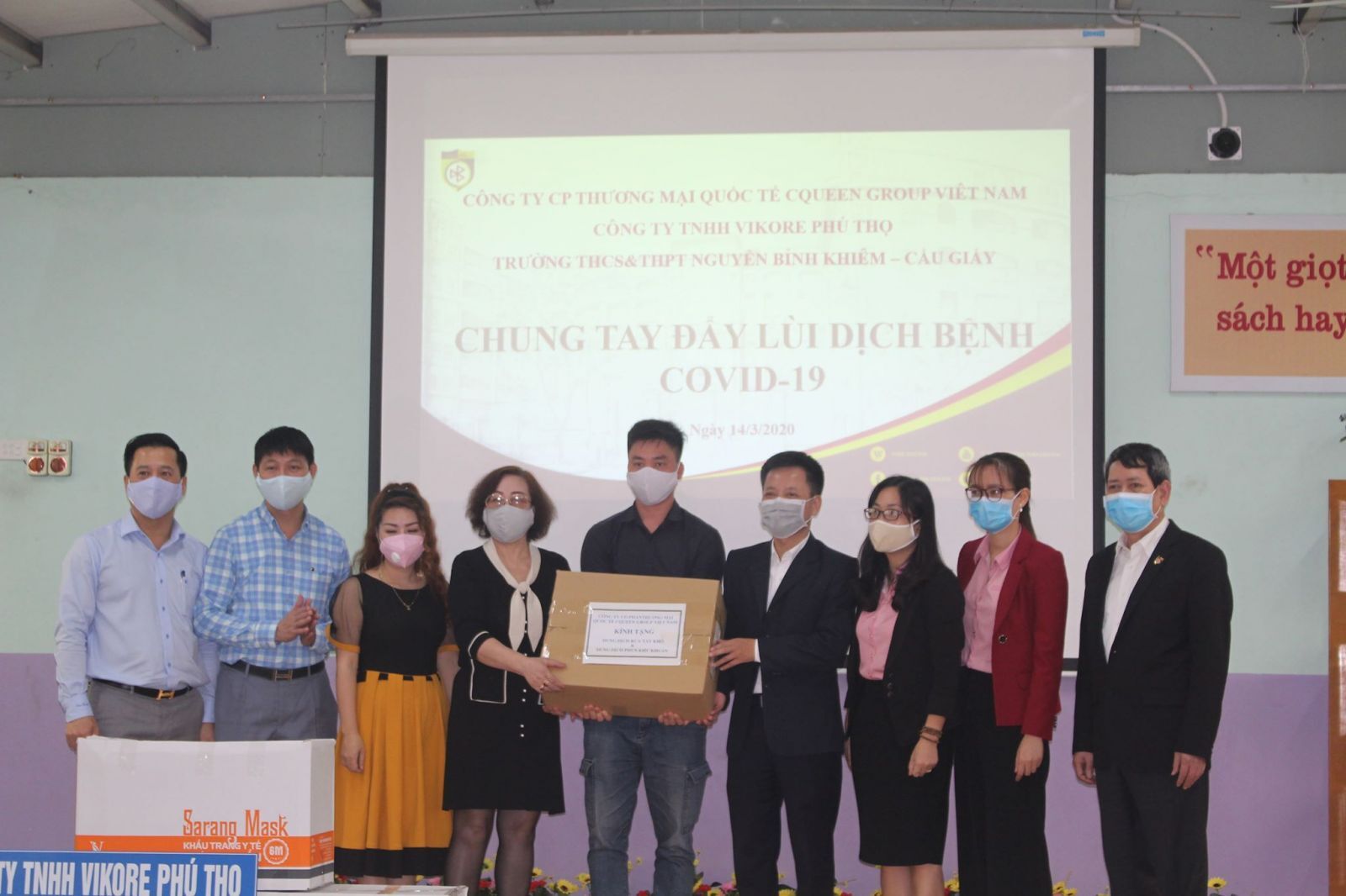 Sáng nay 14/3, Câu lạc bộ Báo chí Phú Thọ tại Hà Nội đã phối hợp cùng Công ty TNHH Vikorea Phú Thọ và Công ty CP Thương mại Quốc tế CQueen Group hỗ trợ, trao tặng hàng nghìn khẩu trang kháng khuẩn, dung dịch rửa tay khô, cồn sát khuẩn khử trùng cho học sinh, giáo viên Trường THCS Nghĩa Tân và Hệ thống Trường Chất lượng cao THCS-THPT Nguyễn Bỉnh Khiêm (tại quận Cầu Giấy, Hà Nội).