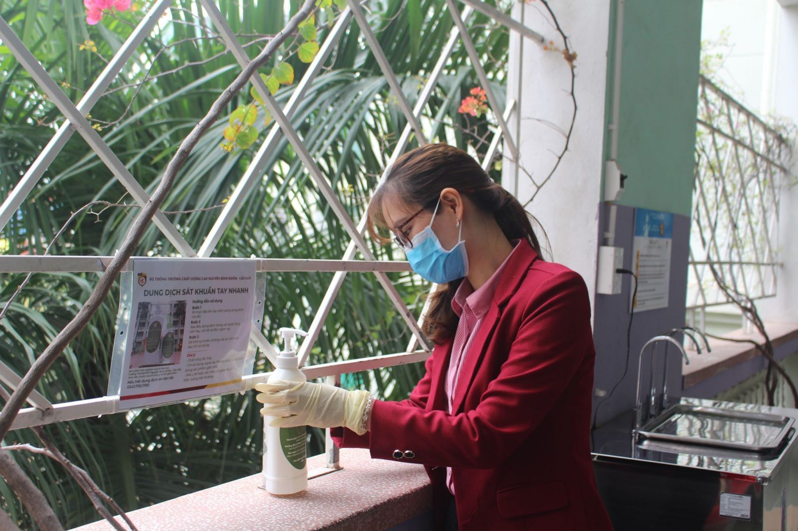 Chuẩn bị dung dịch rửa tay sát khuẩn tại khuôn viên trường THCS Nguyễn Bỉnh Khiêm.