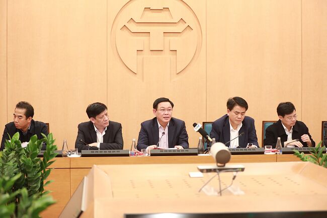 Kết luận tại cuộc họp, Bí thư Thành uỷ Hà Nội Vương Đình Huệ cho biết, trước tình hình hiện tại người dân không nên hoang mang, lo lắng vì Hà Nội đã rất quyết liệt, tích cực trong phòng chống dịch COVID-19 thời gian qua và đã có nhiều biện pháp xử lý, khoanh vùng dịch kịp thời, khẩn trương. Thành phố sẽ dừng khai thác máy bay, thực hiện tiêu độc khử khuẩn và cách ly 176 nhân khẩu tại khu phố bệnh nhân sinh sống. Tuy nhiên vẫn cần phải bảo đảm cuộc sống sinh hoạt của người dân.
