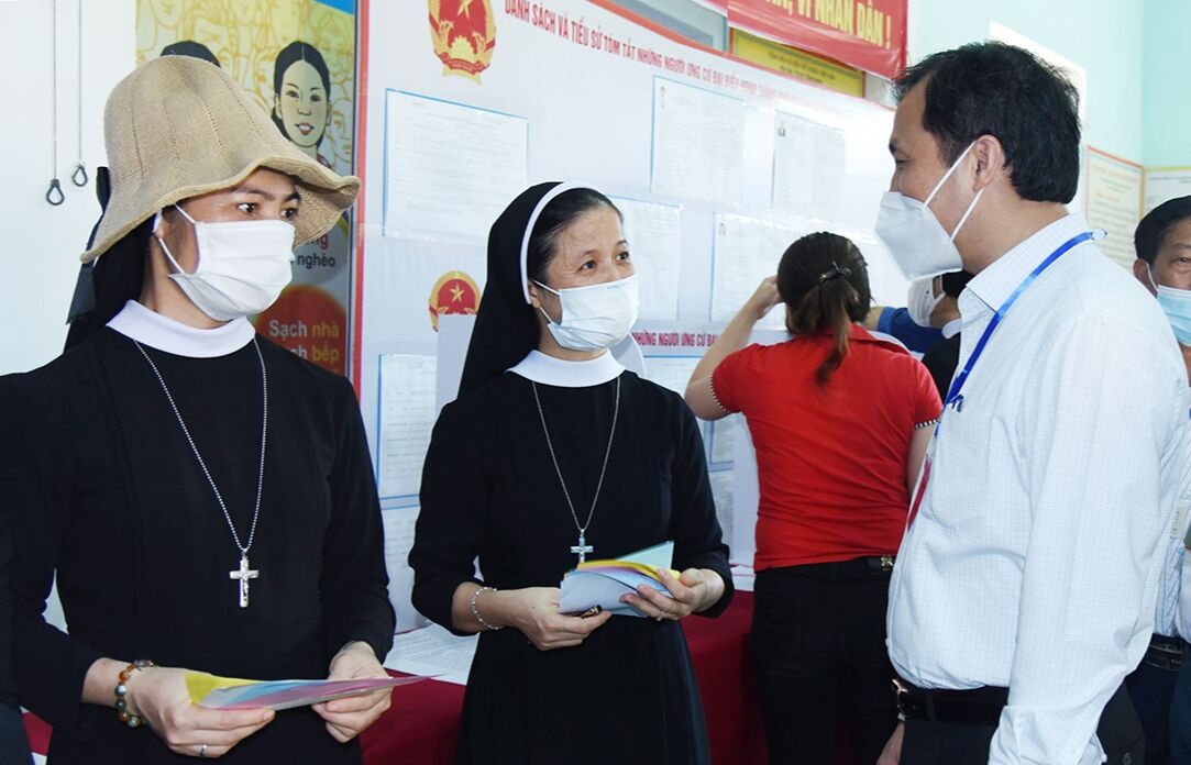 Đồng chí Bí thư Tỉnh ủy Hà Tĩnh Hoàng Trung Dũng trò chuyện với các nữ tu giáo xứ Chân Thành, tại Khu vực bỏ phiếu số 5, xã Thạch Trung (TP Hà Tĩnh).