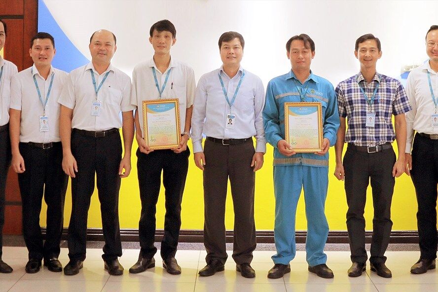 Anh Đường Khánh Tùng (thứ tư từ trái sang) và anh Trần Ngọc Kỳ (thứ ba từ phải sang) nhận thư biểu dương của Ban lãnh đạo Công ty. Ảnh : laodong.vn