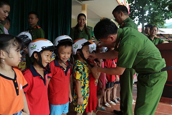 Những chiếc mũ bảo hiểm đạt chuẩn chất lượng được trao cho các em học sinh.