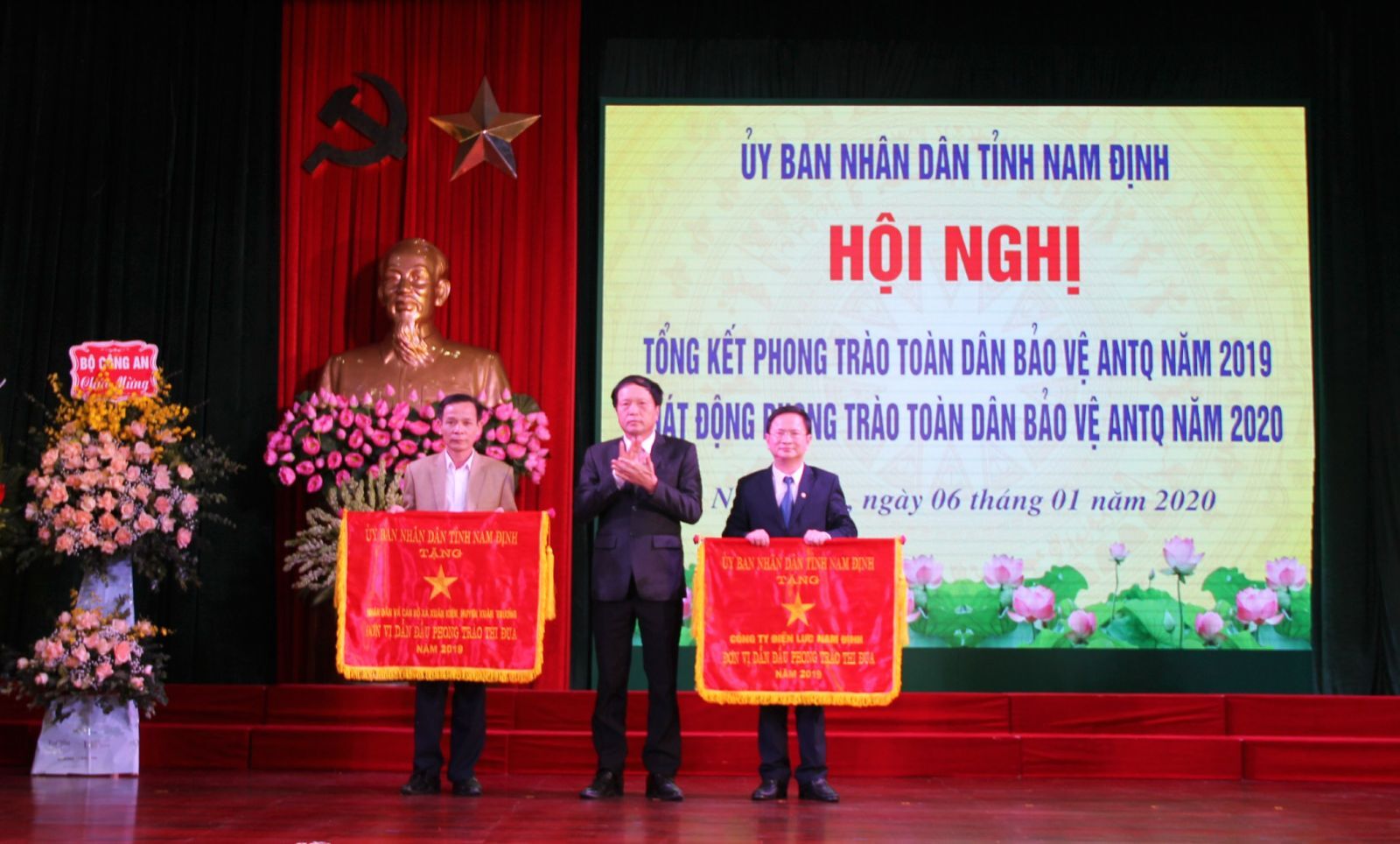 Đại diện lãnh đạo Công ty Điện lực Nam Định (đứng thứ ba từ trái sang) nhận cờ của UBND tỉnh tại Hội nghị Tổng kết phong trào toàn dân bảo vệ ANTQ năm 2019, Phát động phong trào toàn dân bảo vệ ANTQ năm 2020