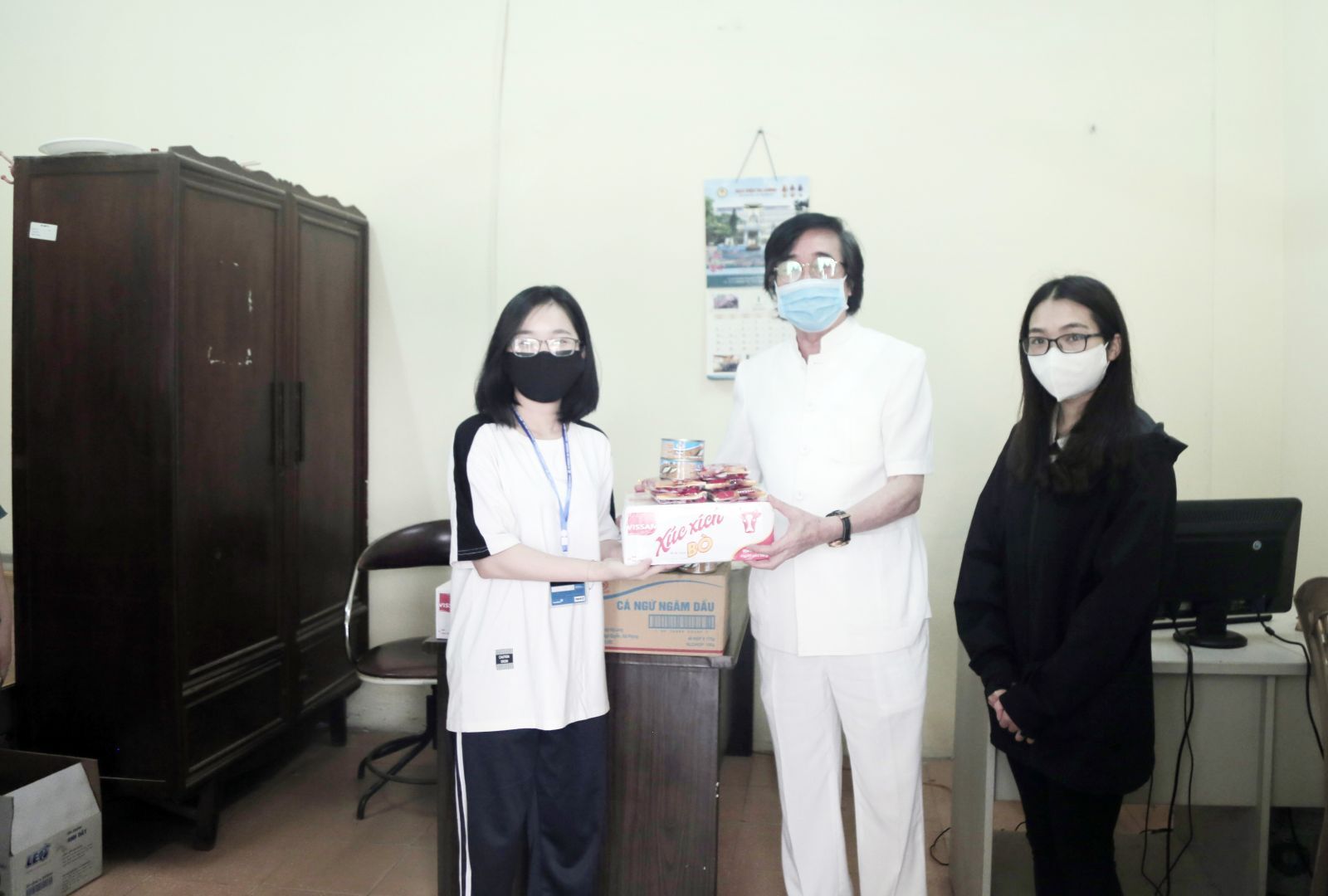 Họa sỹ, TS. Thế Hùng (con thầy Thế Phiệt - Nguyên Bí Thư Đảng uỷ, Phó Hiệu trưởng trường Đại học Tài chính kế toán Hà Nội nay là Học viện Tài chính) đại diện cho nhóm thiện nguyện trao quà hỗ trợ sinh viên nội trú ngày 17/4/2020