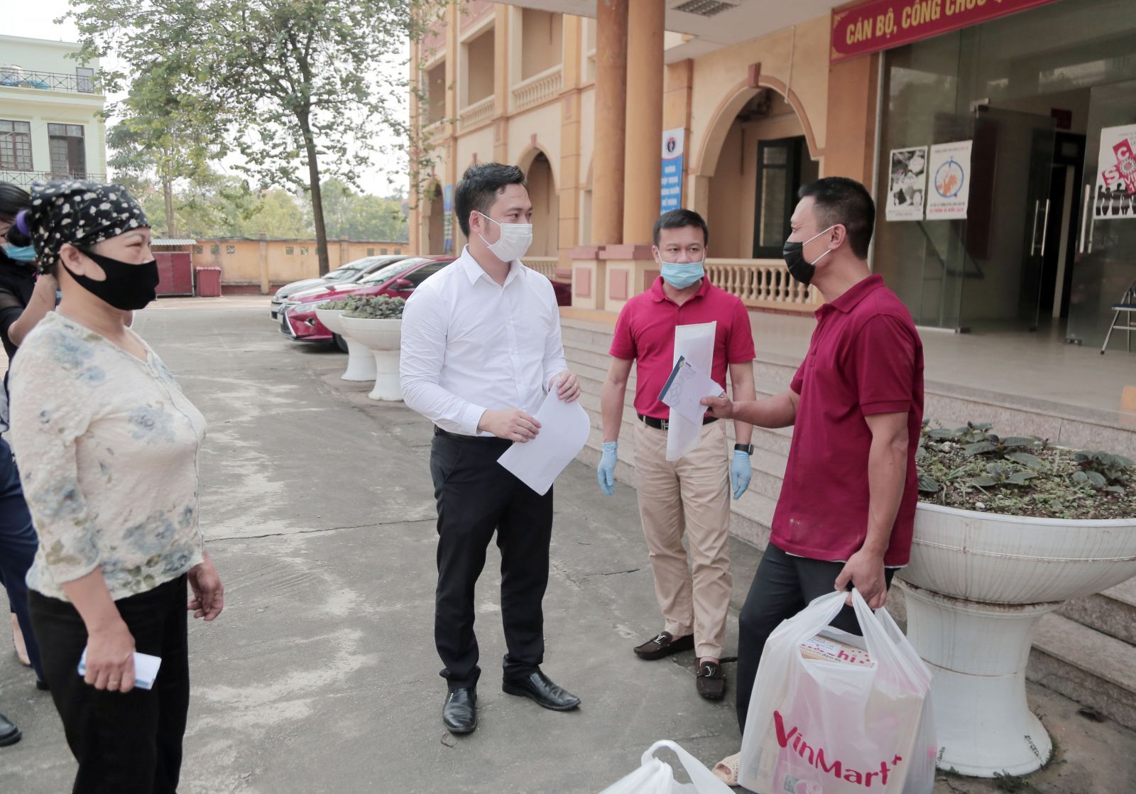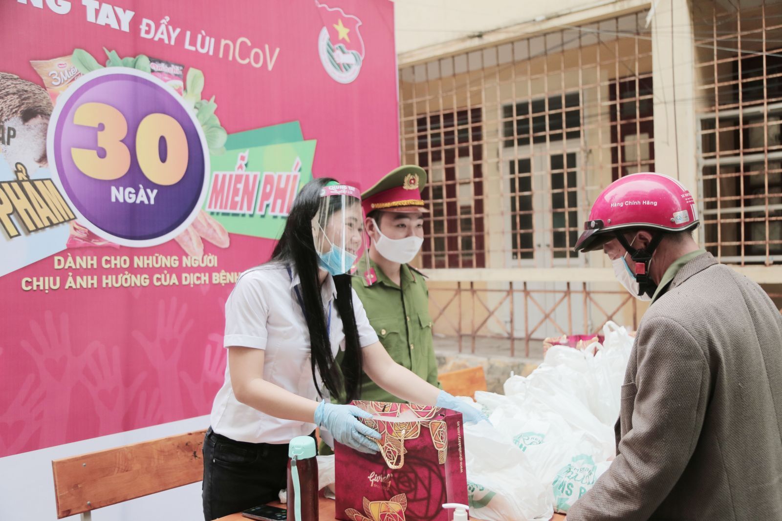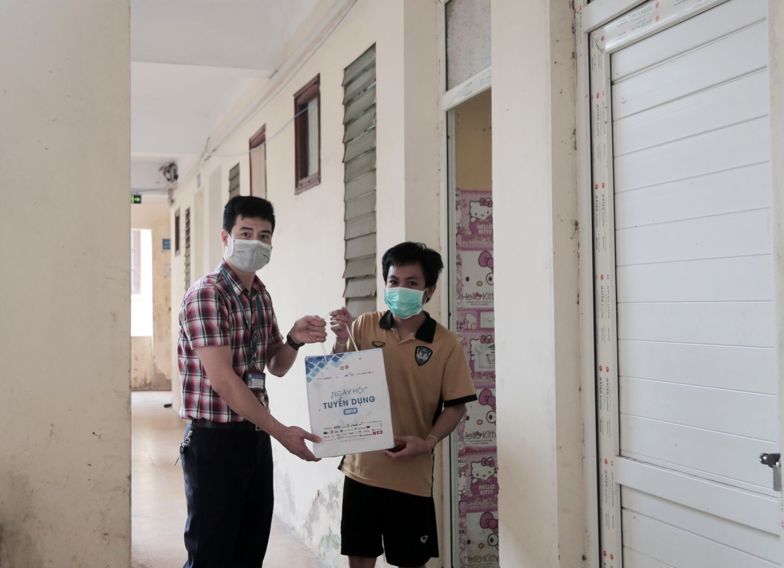 Cựu sinh viên Học viện Tài chính trao quà cho người được thụ hưởng của Chương trình “Chung tay đẩy lùi nCov" (sáng 20/4/2020 tại KTX B7, Học viện Tài chính)