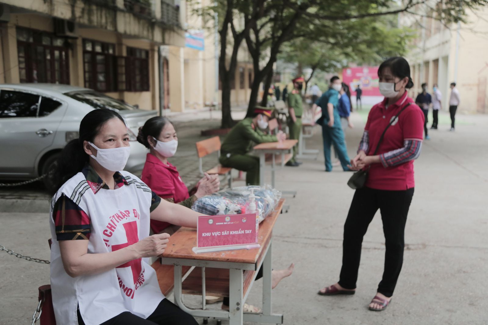 Khu vực sát khuẩn tay và test nhanh thân nhiệt phòng dịch bệnh Covid-19
